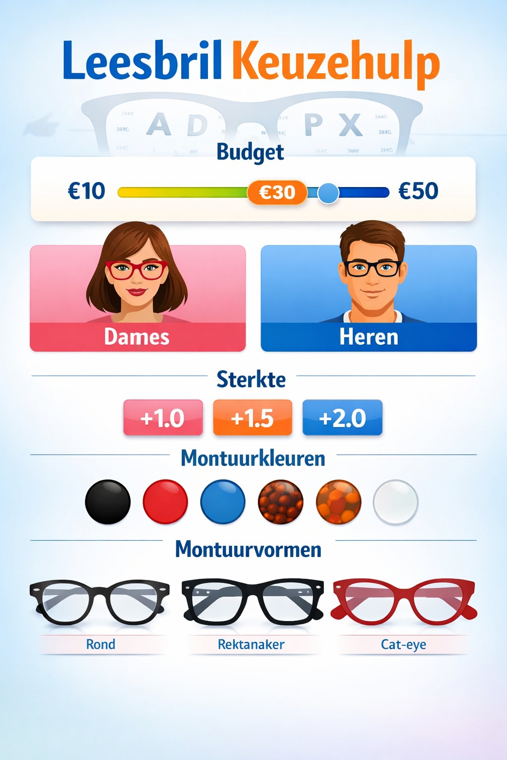 We verkopen kant-en-klare leesbrillen van €9,95 tot ongeveer €50. Leesbrillen op maat zijn verkrijgbaar vanaf €129,95 en vallen buiten deze keuzehulp, omdat dit exclusieve modellen zijn met specifieke opties in montuur en sterkte.