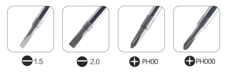 • PH000 en PH00 zijn Phillips (kruiskop) maten voor hele kleine schroefjes; de toevoeging “-75” verwijst naar de (schacht/blad)lengte van 75 mm.
